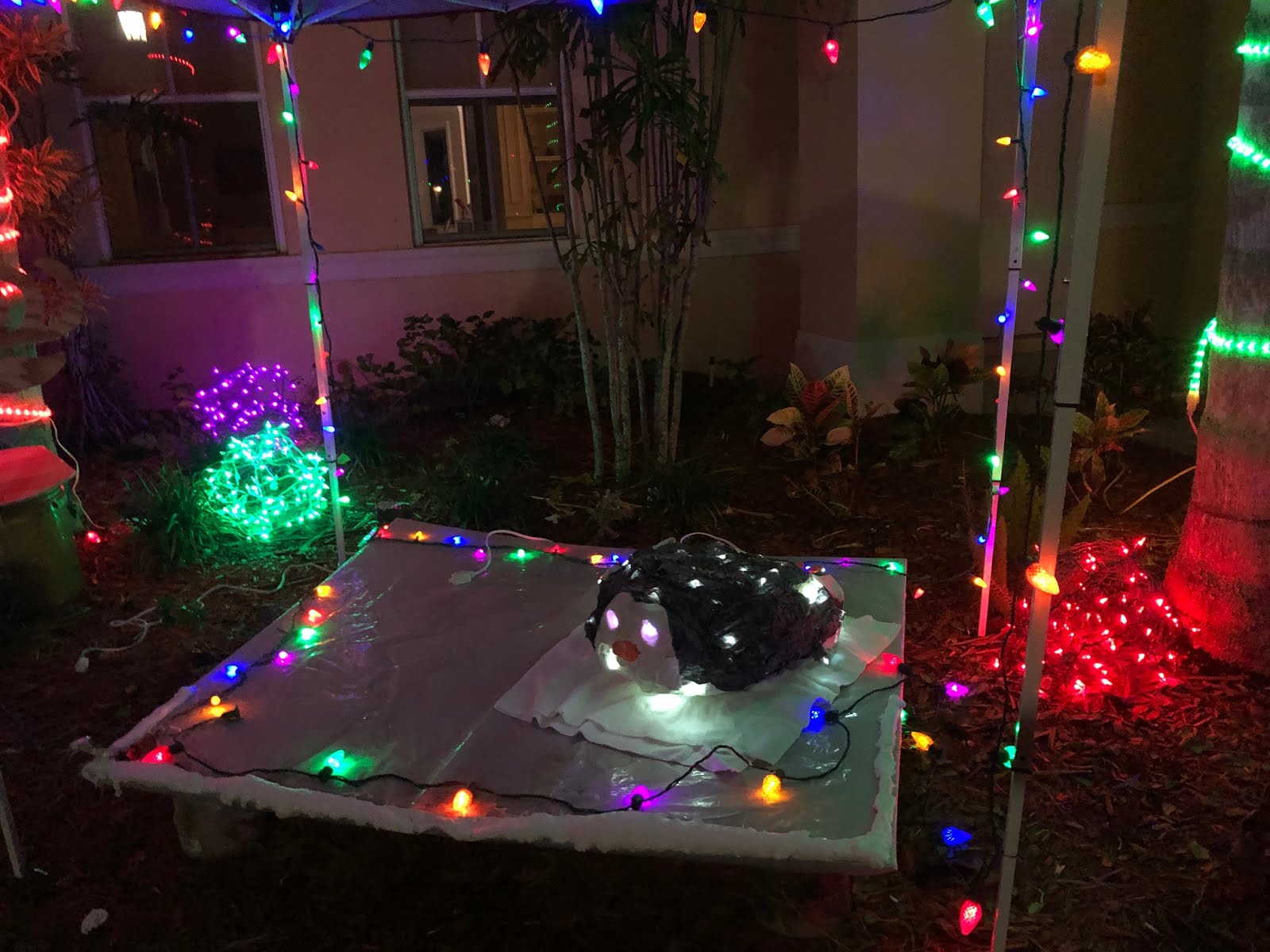 One thought I had along the way was to put lights on the cage before the mache, but I wasn't sure how that would come out. So instead, I wrapped the entire structure in an LED strand of lights. I selected a bright white light.